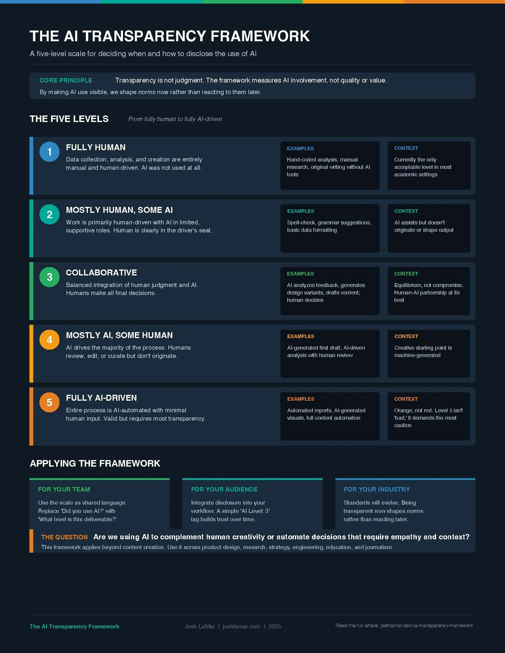 This framework was designed for content creation, but it applies across any discipline where AI is being integrated: product design, research, strategy, engineering, education, journalism. Anywhere humans and AI are collaborating on output that others will consume, the question of transparency applies.